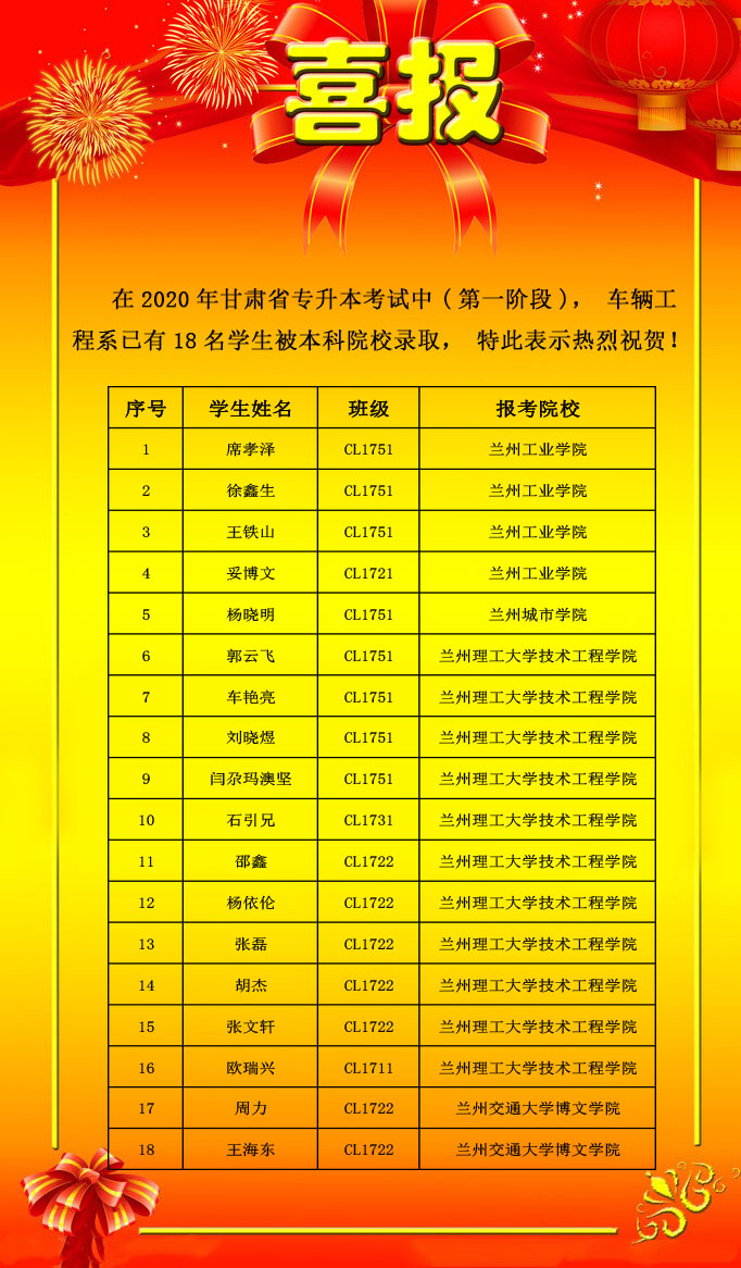 千娇百媚花满枝,结束频传梦复织。在2020年甘肃省“专升本”考试中,我系学生席孝泽、徐鑫生等18名同学考取兰州工业学院、兰州城市学院等省内本科院校,他们将在学业上继续生造,为我系在校生树立了榜样,特此表示热烈祝贺!