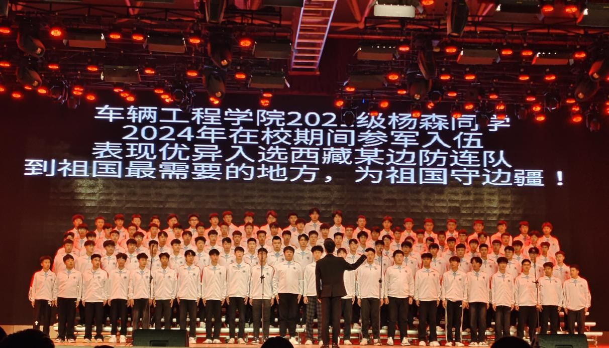 车辆工程学院合唱团的同学们深情演绎《奉献》,此歌曲以我院2021级杨森同学为主线,通过感人至深的歌曲深情演绎了我院学子奔赴祖国边疆保家卫国的赤诚忠心,那细腻的情感传递,深深打动了在场评委与观众。