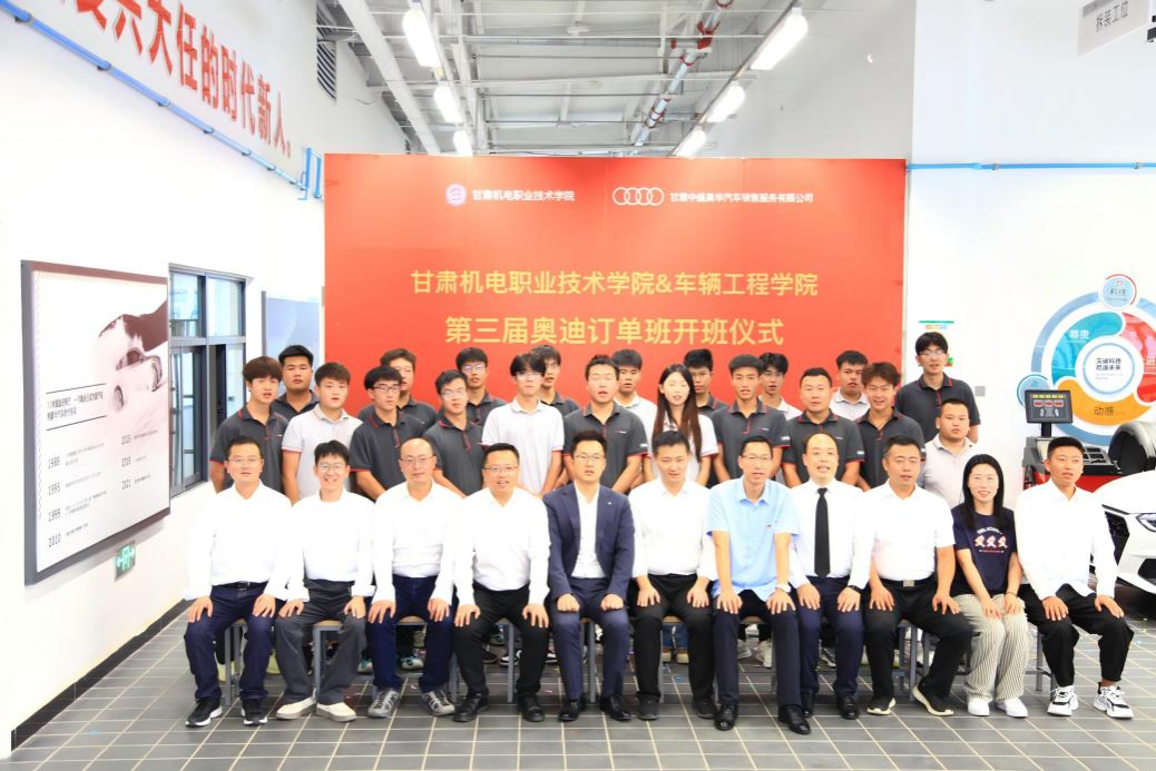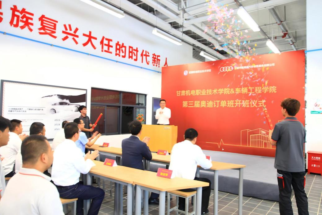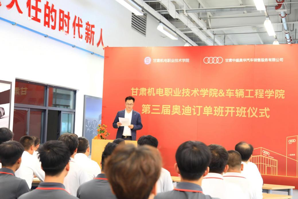 仪式上,甘肃中盛奥华汽车销售服务有限公司总经理葛建云首先向加入奥迪订单班的各位学员表示热烈的欢迎然后从企业发展前景、用人标准、订单班培育成果产出等方面做出详细阐述,鼓励同学们以秋季的丰饶,滋养技术的种子,以奥迪的创新精神,点燃学习的火花。期待每一位学员都能在这里找到属于自己的未来之路,实现梦想。