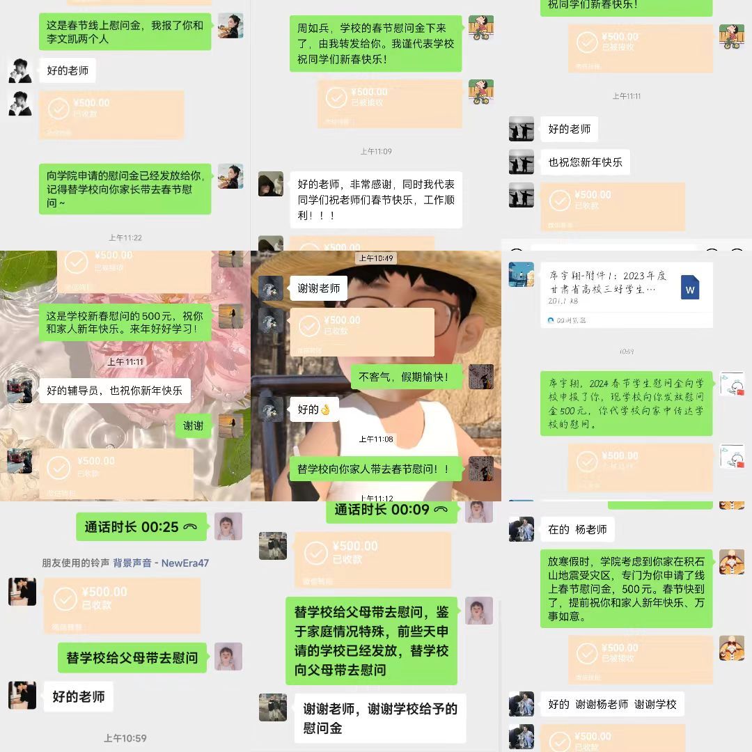 为高质量推进学校精准资助,广泛开展资助政策宣传,构建家校联动机制,根据学校相关文件要求,在学校党委委员、纪委书记、监察专员李自勇的带领下,车辆工程学院全体班子成员、辅导员和受慰问学生班主任组成了线上线下慰问工作小组,于1月31日开始开展了为期一周的“寒假慰问送温暖,浓浓关怀显真情”慰问活动,向学生及家长送去新春祝福和学校的问候关怀。共计线上慰问学生31名,线下慰问3名。