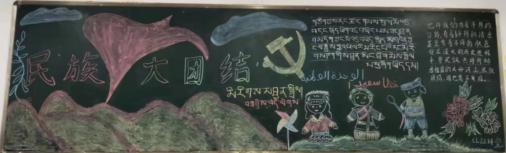 活动八:创意板报设计:以“民族团结进步教育”为主题开展创意板报设计展示,各班级积极开展,同学们集思广益,用粉笔绘画和书写民族团结进步发展,用内心表达和传递爱国情怀。