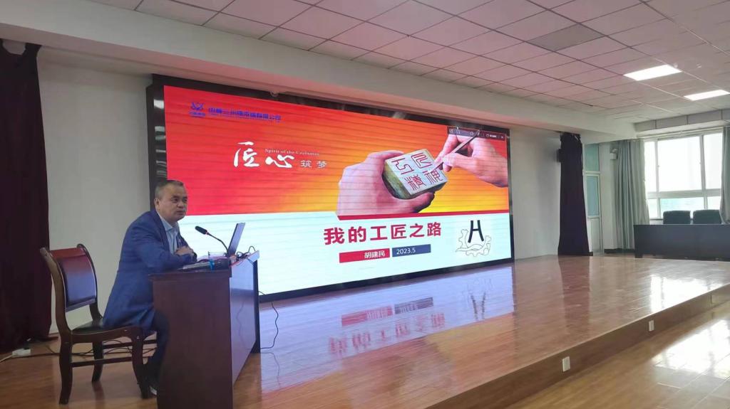 会上,胡建民从公司简介、个人基本情况、个人和工作室的主要工作、新时期工匠精神四个方面分享了自己如何从一名普通的企业员工成长为技术能手、能工巧匠方面为同学们宣讲,同时也勉励同学们要爱国奉献、勇于担当、爱岗敬业、刻苦钻研,争取早日成为新时代工匠。