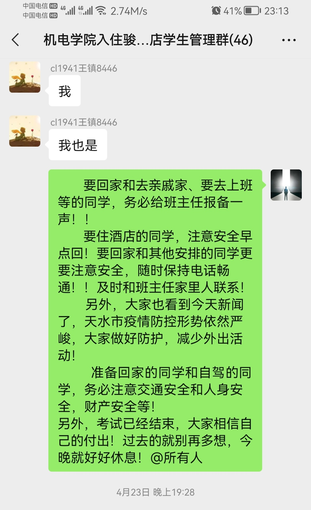 4月22日晚,待所有学生的考试必备打印资料和学院慰问品发放完毕已是晚上10点,拖着疲惫的身躯回到自己的房间,他依旧放心不下第二天考试的准备情况,一次次确认,一次次叮嘱,事无巨细。此刻,他更像是兄长,他比考试的同学更担心和紧张。累是肯定的,而他毫无怨言。在这个阶段,他的身份不仅仅是辅导员、更担当着配送员、联络员、疏导员的角色。因为被需要,所以勇往直前。手机里装下的是文件,心里放不下的是学生。是他,带给同学们温暖;是他,让同学们心里踏实;是他,让同学们面对这冰冷的疫情,及时传递着学院最温暖的关怀。