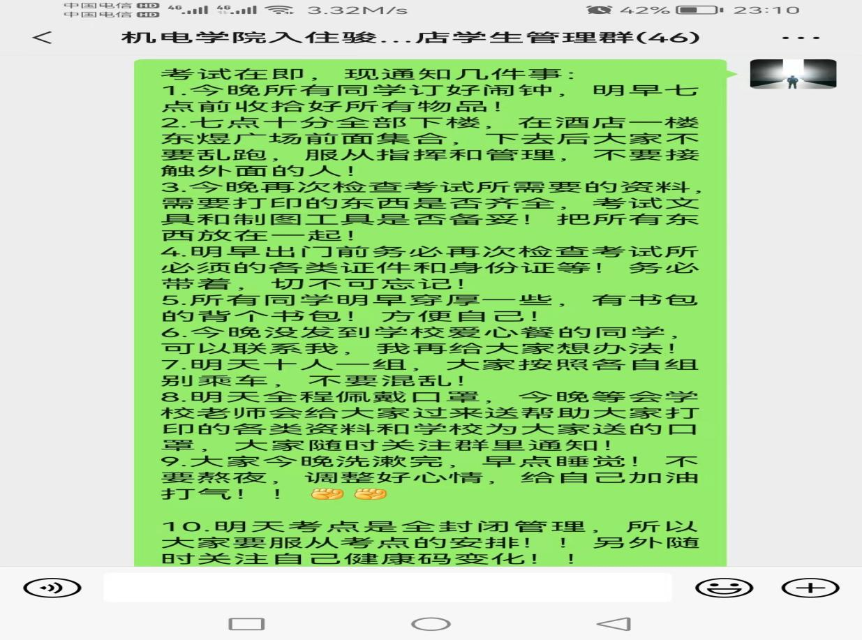 在闭环隔离留观的几天里,学校为学生发放的一次次福利和爱心慰问品,让他深切地感受到了什么是机电的大爱情怀;校领导一场场紧急的会议让他切身学习到了什么才是冲锋在前;在校老师凌晨十二点还在汇总的数据,让他真实地体会到了什么才是舍小家顾大家的无私精神。工作群里,看见学校各级领导在深夜依旧为同学们考试的事忙碌、后勤人员开着满载盒饭和慰问品的车辆奔波在各酒店的照片,心里亦是感动,能和这群身体力行的同仁并肩作战,便是当下最大的幸福。