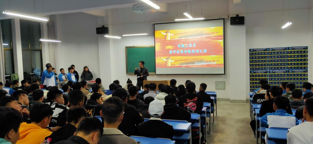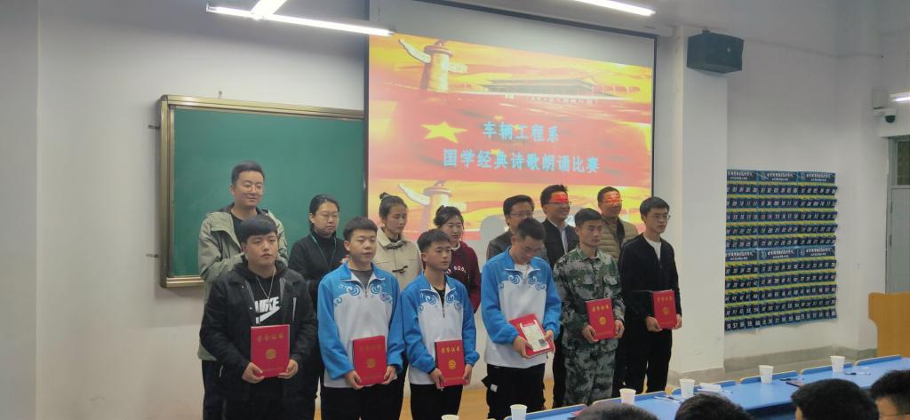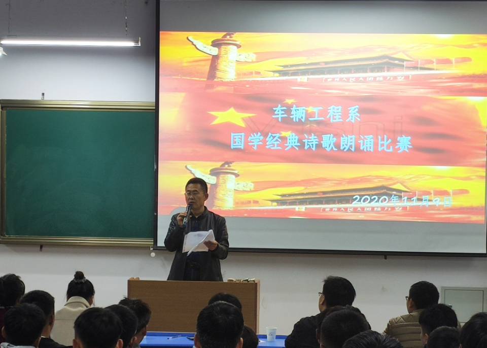 11月9日晚19:00,车辆工程系在南校区5-302教室举行了“国学经典诵读”比赛。车辆工程系党总支书记陈怀宝、副主任张杰、系部辅导员、班主任出席活动并担任评委。2020级新生代表观看了比赛。