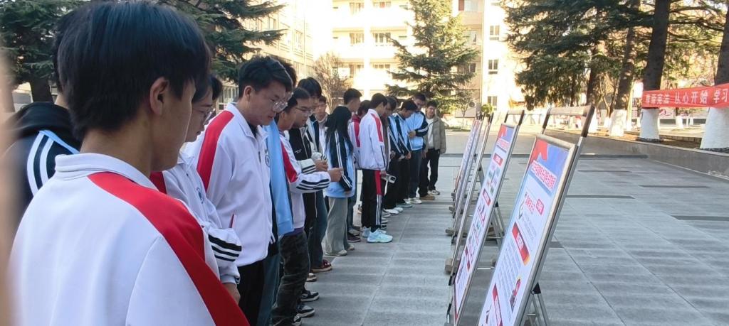 活动期间,学院有序组织全体学生分批参观学校宪法宣传展板。从宪法修正案核心内容到公民基本权利义务,从法治建设成果展示到典型案例警示,图文并茂的展板内容将抽象的法律条文转化为直观易懂的知识载体。同学们驻足凝视、轻声研讨,在翻看资料、交流感悟中厘清宪法与专业学习、未来职业的内在关联,深刻认识到宪法不仅是治国安邦的总章程,更是青年成长成才的行为指南,进一步筑牢了“尊崇宪法、学习宪法”的思想自觉。
