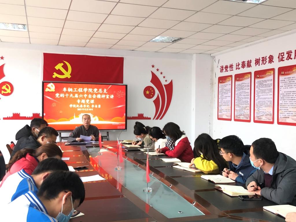 12月10日下午,学院党委委员、纪委书记、省监委派驻学院监察专员李自勇在3号教学楼B301会议室为车辆工程学院全体党员、入党积极分子等作学习贯彻党的十九届六中全会精神宣讲报告。车辆工程学院主要负责人主持会议。