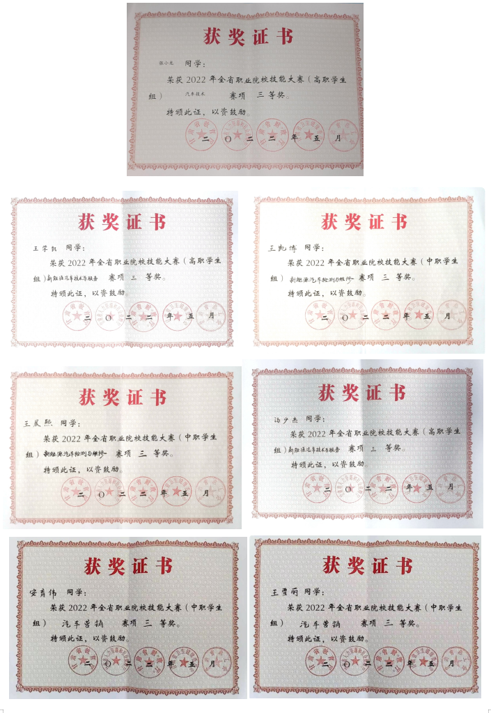 在比赛过程中,我院师生团结拼搏,沉着应战,充分展示了我院的专业特色与实力,精彩呈现了参赛学生的精湛专业技能与奋发向上的精神风貌。最终新能源汽车技术与服务和汽车营销赛项两个赛项荣获3个二等奖,汽车技术、汽车检测与维修等赛项荣获12个三等奖,为2022年全省技能大赛划上了圆满的句号。