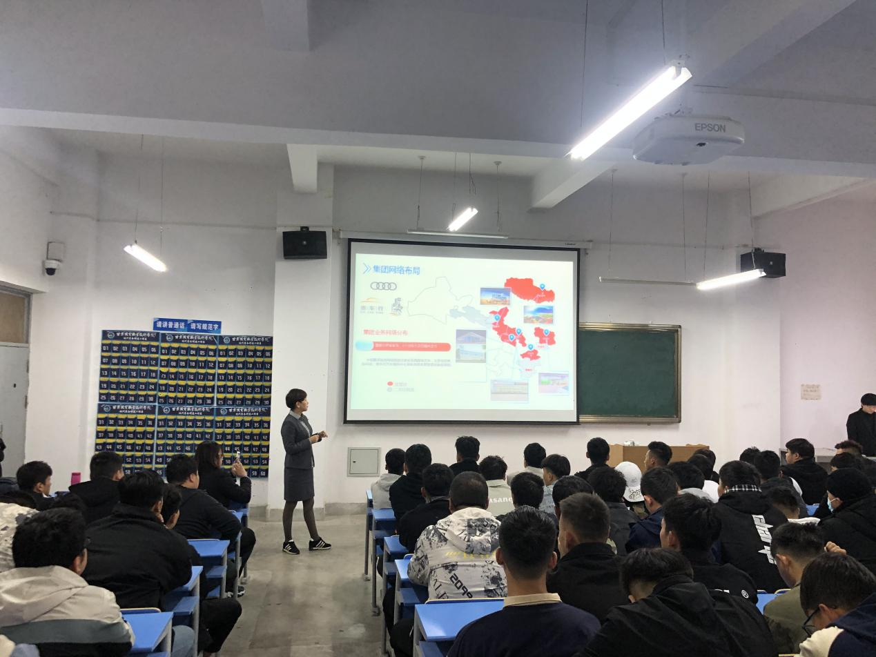 各集团向在场同学放映视频宣传片,展示了公司自建立以来,秉持着立足西北,拓展全国,多元化发展的战略,将集团精心打造为建一流工程、创一流业绩的品牌企业的历程。并就公司目前所拥有的资质,所获奖项,以及公司之前承建的各个项目等企业历史一一向同学们做了详细的介绍。随后将公司的规章制度,福利待遇,企业文化,现有产业结构,组织构架,人力资源政策及本次招聘岗位情况等同学们最为关心的问题逐一做了介绍,并就同学们的提问现场进行了耐心细致的回答。