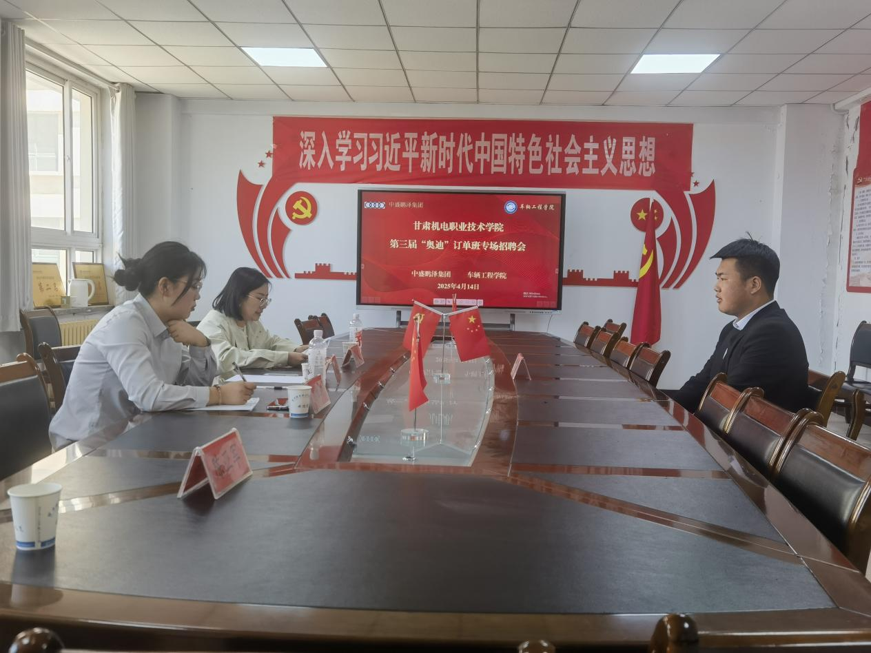 4月14日,车辆工程学院第三届“奥迪”订单班专场招聘会在北校区立德楼举行中盛鹏泽集团所属省内各公司招聘负责人、学院负责人和全体“奥迪”订单班学生参会。